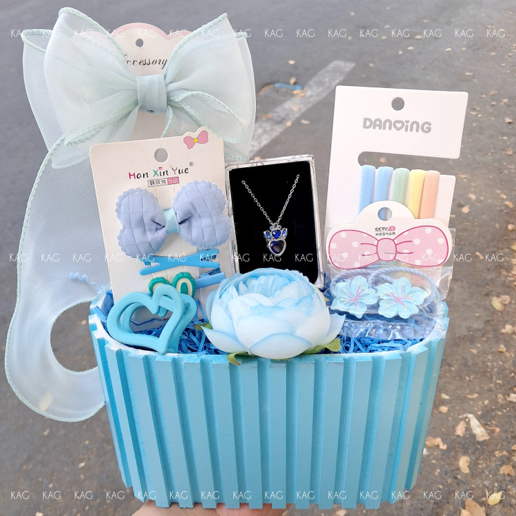 محتوای باکسگیره پاپیون حریر دنباله دار _ پک 3 عددی گیره فانتزی _ گردنبند نگین سواروسکی پرنسسی طرح قلب و تاج _ باکس گردنبند _ پک۵عددی کش مو حوله ای _ یک جفت کش مو طرح پلومریا آبی _ کیلپس شمعی کوچک طرح قلب _ گل _ پوشال _ باکس